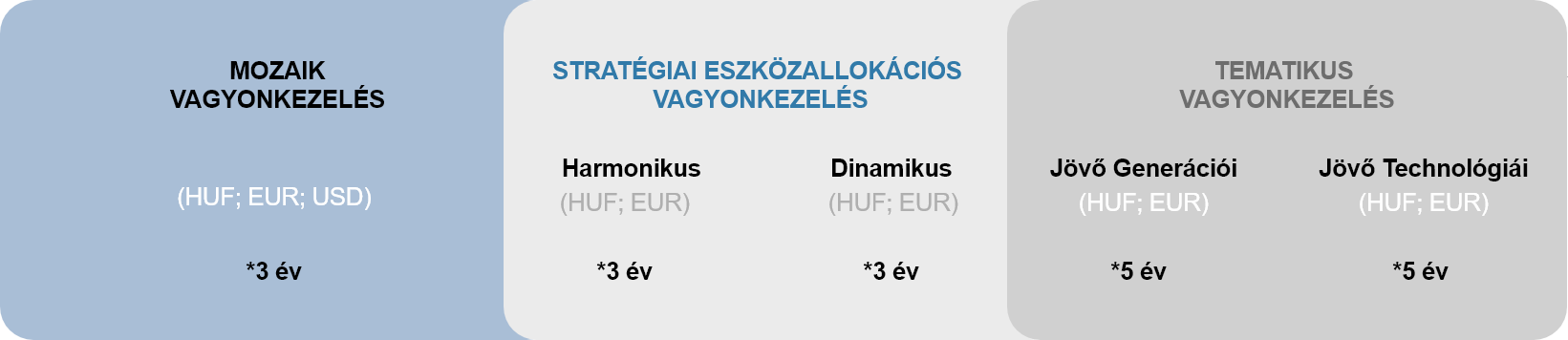 Különböző befektetési filozófiákat és eltérő mértékű döntéshozatali szabadságot tükröznek a választható vagyonkezelési szolgáltatások: a jórészt modellalapú stratégiától a főbb részvényindexekhez kötött befektetési politikán át, a teljes diszkrecionális döntéshozatalig, amikor nem csak az eszközosztályon belüli összetételről, hanem az aktuális piaci helyzetre reagálva a portfólió kockázati kitettségének érdemi változtatásáról is a megbízott szakemberek döntenek, legjobb tudásuk szerint.
